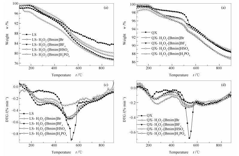 • Four different kinds of ionic liquids(ILs), namely, 1-butyl-3-methylimidazolium bromide([Bmim]Br), 1-butyl-3-methylimidazolium tetrafluoroborate([Bmim]BF4), 1-butyl-3-methylimidazolium hydro-sulfate([Bmim]HSO4), and 1-butyl-3-methylimidazolium dihydrophosphate([Bmim]H2PO4) were selected to add to the H2O2 solution (30%), respectively, to obtain four mixed solutions. Then, two kinds of deashed high-sulfur coal (LS, QX) desulfurization experiments were tested with above mixed solutions under mild conditions, respectively. The contents of different sulfur forms in coal samples before and after desulfurization were determined by wet chemical method, and the coal samples before and after desulfurization were characterized using Fourier transform infrared spectroscopy (FT-IR), X-ray photoelectron spectroscopy (XPS), scanning electron microscope (SEM), and thermogravimetric (TG). The results show that the addition of ionic liquids can make the H2O2 oxidation desulfurization ability enhance, and pyrite sulfur and organic sulfide sulfur in coal are obviously removed. After treated by the ILs/H2O2 system, the small size particle decreases, the space among the particles increases, and the pits on the coal surface become obvious. Moreover, the thermogravimetric test results show that the total weight loss of the coal sample treated by the ILs/H2O2 system increases and the peak temperature of some volatile substances lowers.