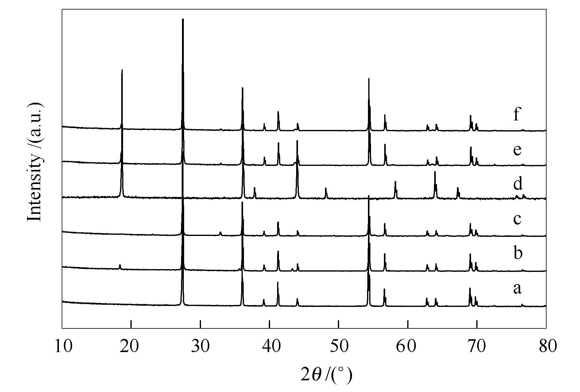 a: TiO2; b: Li/TiO2; c: Mn/TiO2; d: LiMn2O4;e: LiMn2O4/TiO2; f: Li-Mn/TiO2