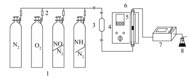 1: gas; 2: flowmeter; 3: mixed gas cylinder; 4: temperature controller; 5: catalytic reactor; 6: tubular furnace; 7: flue gas analyzer; 8: absorption apparatus for tail gas