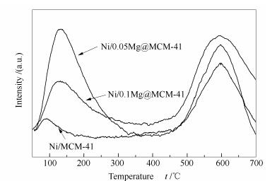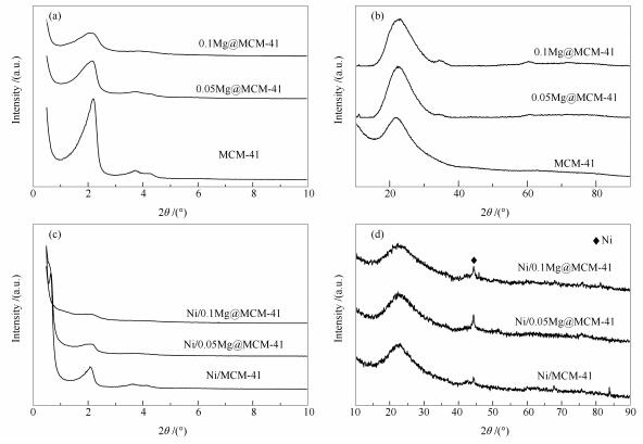• A series of xMg@MCM-41(x=0, 0.05, 0.1) functional mesoporous materials were synthesized by a novel in-situ one pot method and then were used as support for Ni based catalysts. The results of XRD and TEM show that when the amount of Mg/Si (molar ratio) is 0.05, Mg@MCM-4 with a regular and ordered mesoporous structure is synthesized where Mg is introduced into the framework of MCM-41. Introducing Mg into the framework of the support can significantly enhance the basic properties of the catalyst, thus promoting the adsorption and activation of CO2. The catalysts prepared in the experiments all have good thermal stability and catalytic activity. Among them, Ni/0.05Mg@MCM-41 shows the best low temperature reaction activity in the CO2 methanation reaction.