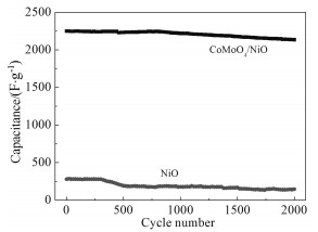 Three-dimensional NiO/CoMoO4 composite electrode materials were successfully prepared by two-step hydrothermal and high temperature annealing. The structure, surface morphology and electrochemical performance were characterized using X-ray diffraction, scanning electron microscopy, transmission electron microscopy and electrochemical method. The results showed that NiO/CoMoO4 composite materials owned typical nanowires/nanosheet structure, which were different from needle-like morphology of NiO. The structure provided more active sites for the active substance, compared with pure NiO. The specific capacitance of the composites could reach 2253 F/g at the current density of 0.3 A/g, which was higher than that of pure NiO. It displayed good cycling stability with 92% capacitance retention after 2000 cycles due to the synergistic effect between NiO and CoMoO4.