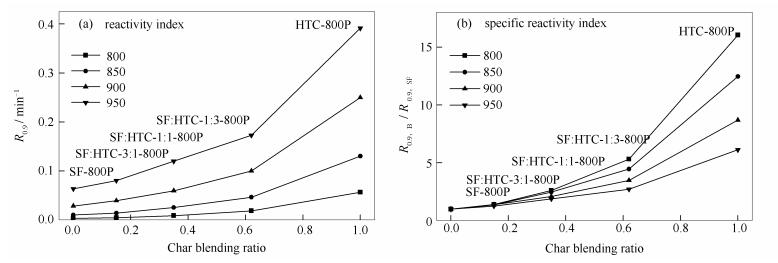 • The influences of gasification temperature (800-950℃) and blending ratio (3:1, 1:1, 1:3) on the isothermal CO2 co-gasification reactivities of Shenfu bituminous coal char (SF char) and HTC char were investigated using an atmospheric thermogravimetric analyzer (TGA). Moreover, the activation energy of char gasification and its influence factors were explored. The results show that the greater surface area and the higher ash content are the main reasons for the high gasification reactivity of HTC char. The reactivities of mixtures with low HTC char proportion are more sensitive to temperature at low temperature range. The activation energy increases with the increase of carbon conversion, and the activation energy correlates well with the blending ratio and the molar ratio of active (K+Na)/Ca in the char.