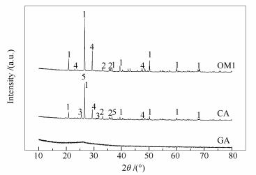 1: SiO2(quartz); 2: Fe2O3(hematite); 3: CaSO4(anhydrite); 4: CaCO3(calcite); 5: CaAl2Si2O8·4H2O (gismondine)