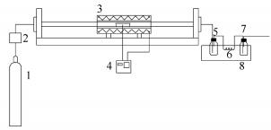 1: gas cylinder; 2: flowmeter; 3: tube furnace; 4: temperature control; 5: absorption bottle; 6: coil; 7: absorption bottle; 8: cold trap