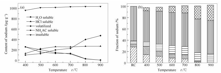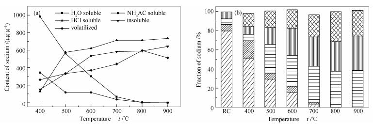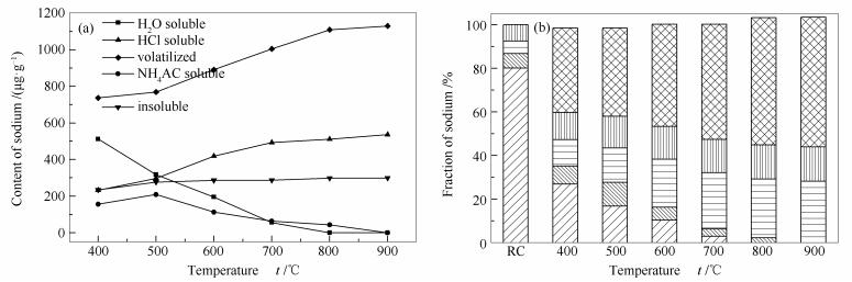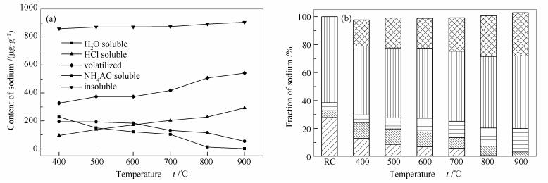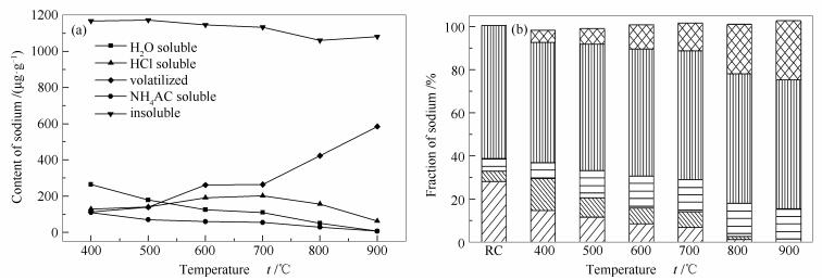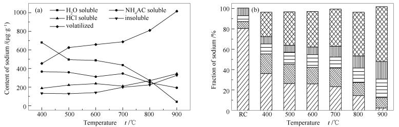 (a): content of various sodium forms in chars; (b): fraction of various sodium forms in chars