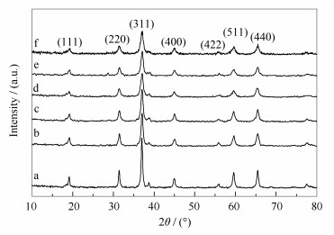 a: Y/Co=0 (Co3O4); b: Y/Co=0.01; c: Y/Co=0.02; d: Y/Co=0.03; e: Y/Co=0.04; f: Y/Co=0.05