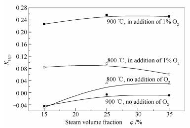 • Shengli brown coal in 150-180 μm was gasified at 800-900℃ in a simulated entrained-flow reactor, φ80×3 000 mm. Conversion and kinetics of steam gasification reaction of the lignite were discussed to investigate synergistic effects of oxidation reaction on steam gasification reaction. The results show that lignite conversion under H2O+1%O2 atmospheres is greater significantly than the sum of that under H2O atmosphere and 1%O2 atmosphere, i.e., the increase of lignite conversion from H2O atmosphere to H2O+1%O2 atmospheres is greater than that from N2 atmosphere to N2+1%O2 atmospheres. The synergistic effects are caused by promoting effect of oxidation reaction on steam gasification reaction, and are more obvious as H2O content increasing and temperature rising. Moreover, the similar experiments were carried out in φ40×200 mm cylindrical quartz fluidized bed, and the synergistic effects are also found. The steam gasification reaction rate equation, \begin{document}$ (Z-{{(1-x)}^{\frac{1}{3}}})=\frac{t\beta {{k}_{{{\text{H}}_{2}}\text{O}}}}{R{{\rho }_{\text{C}}}}{{\varphi }_{{{\text{H}}_{2}}\text{O}}}={{K}_{{{\text{H}}_{2}}\text{O}}}{{\varphi }_{{{\text{H}}_{2}}\text{O}}} $\end{document}, is in good agreement with experimental data. This indicates that the apparent rate constant KH2O increases obviously after O2 adding to water vapor, which is the kinetic characteristics of promoting effect of oxidation reaction on steam gasification reaction.