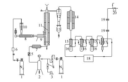 1: nitrogen cylinder; 2: buffer tank; 3: air compressor; 4: rotameter; 5: mass flowmeter; 6: time relay; 7: preheater; 8: screw feeder; 9: water cooling jacket; 10: hopper; 11: fluidized bed reactor; 12: cyclone separator; 13: ash pot; 14: cracking furnace; 15: condenser; 16: oil bottle; 17: final stage trap; 18: low temperature cycling condenser; 19: filter; 20: gas meter