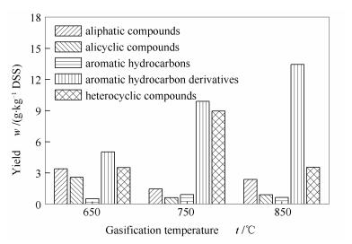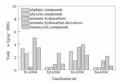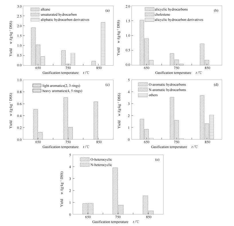 organic compounds in the tar(a): aliphatic compounds; (b): alicyclic compounds; (c): aromatic hydrocarbons; (d): aromatic hydrocarbon derivatives; (e): heterocyclic compounds