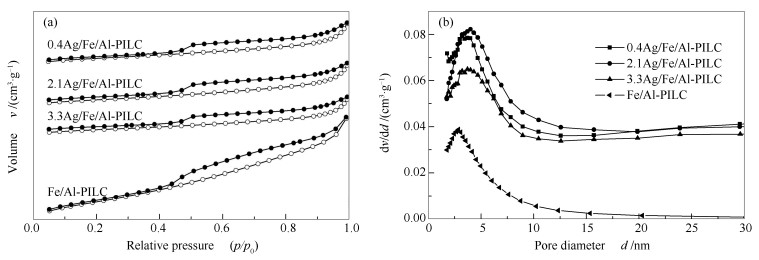 a: 0.4Ag-Fe/Al-PILC; b: 2.1Ag-Fe/Al-PILC; c: 3.3Ag-Fe/Al-PILC; d: Fe/Al-PILC
