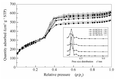 ◆: Al-MCM-41(∞) adsorption; ◇: Al-MCM-41(∞) desorption; ▼: Al-MCM-41(60) adsorption; ▽: Al-MCM-41(60)desorption; ★: Al-MCM-41(30)adsorption; ☆: Al-MCM-41(30)desorption; ●: Al-MCM-41(10) adsorption; ○: Al-MCM-41(10)desorption