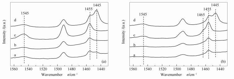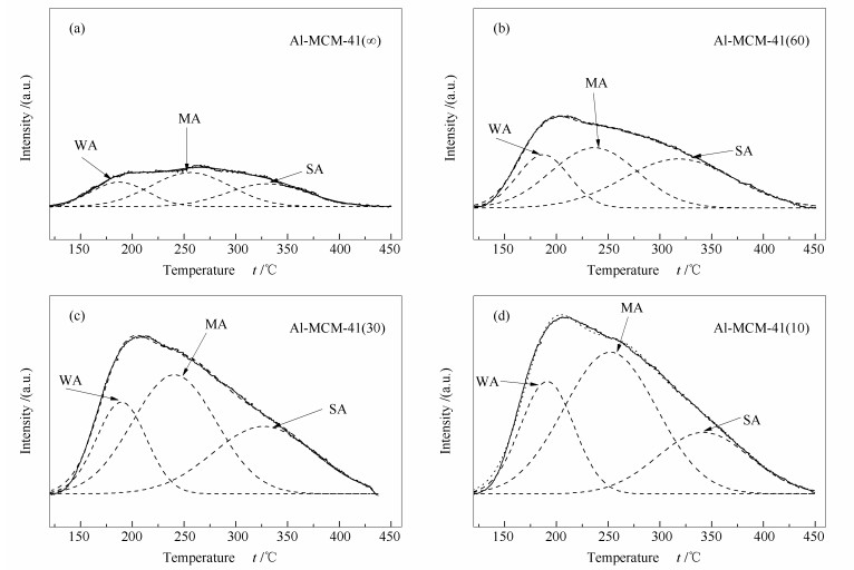 (a): 150 ℃ of desorption temperature; (b): 400 ℃ of desorption temperature a: Al-MCM-41(∞); b: Al-MCM-41(60); c: Al-MCM-41(30); d: Al-MCM-41(10)