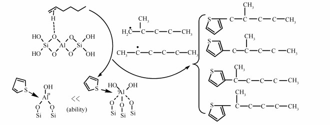 Influence of olefin on the mechanism of thiophene adsorption on the active species of Al-MCM-41 mesoporous zeolites