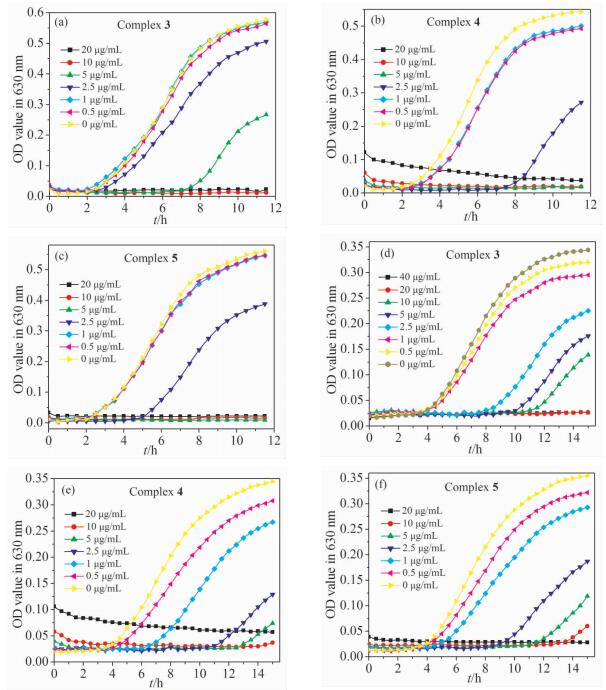 • Three fairly stable high-valence silver complexes [AgEn(BigH)2]2(SO4)3·7H2O (3), [Ag(Py)2(N2)2](OH)2 (4) and [Ag(2-Apy)3(OH)](HSO4)·H2O (5) have been synthesized with ethylenebisbiguanide, pyridine and pyridine derivative as ligands. The products were characterized by IR, elemental analysis and X-ray photoelectron spectroscopy. The growth-inhibitory curves and the minimal inhibitory concentration (MIC) were applied to evaluate the antibacterial ability of complexes, and the photostability of complexes was detected. The results showed that all the complexes begin to inhabit the growth of test bacteria at very low concentration of 0.5 μg/mL, and the MIC values for E.coli are 10, 5, and 5 μg/mL respectively, the MIC values for S.aureus are 40, 20, and 20 μg/mL respectively, indicating the synthesized high-valence silver complexes possess an excellent antibacterial activity. Besides, all the complexes have better antibacterial activity to E.coli than S.aureus.