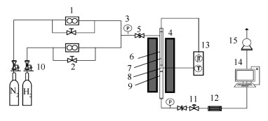 1: mass flowmeter; 2: cutoff valve; 3: pressure gauge; 4: electric furnace; 5: ball valve; 6: reactor; 7: K thermocouple; 8: sample; 9: quartz sand; 10: reducing pressure valve; 11: back pressure valve; 12: circulating cooling system; 13: temperature control system; 14: GC; 15: wet air flowmeter