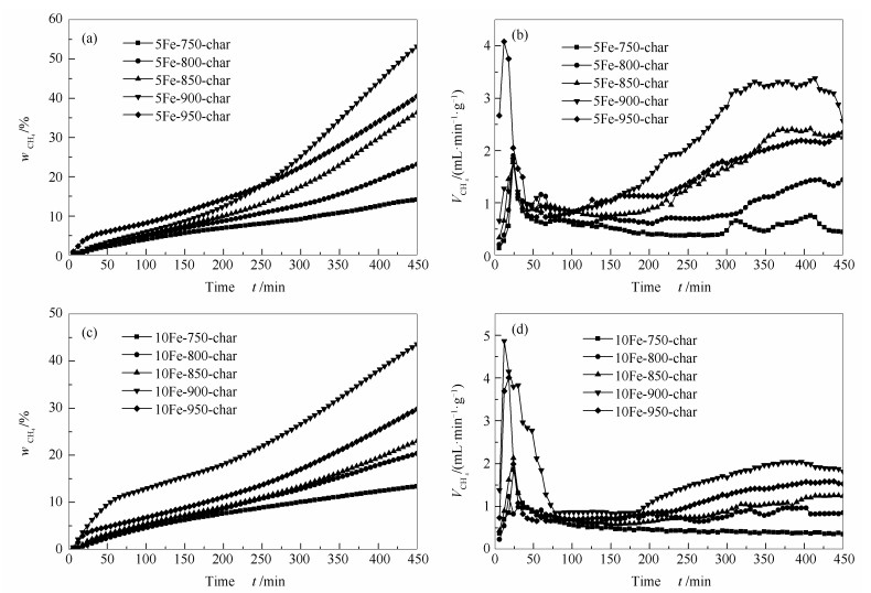 (a): wCH4of 5Fe-t-char; (b): VCH4 of 5Fe-t-char; (c): wCH4 of 10Fe-t-char; (d): VCH4 of 10Fe-t-char