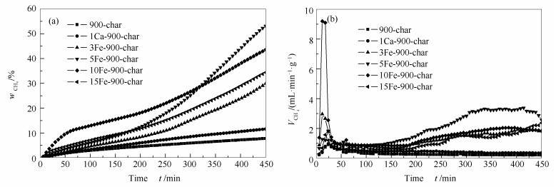 (a): wCH4 of xFe-900-char (x=3, 5, 10, 15)(wCH4/%); (b): VCH4 of xFe-900-char (x=3, 5, 10, 15)