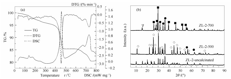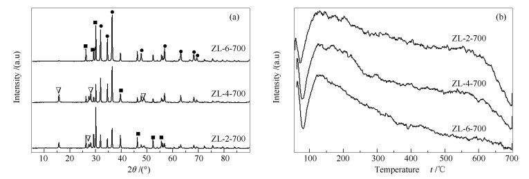 ●:ZnO; ■:La2O3; ∇:La(OH)3; ◇:La2O2CO3