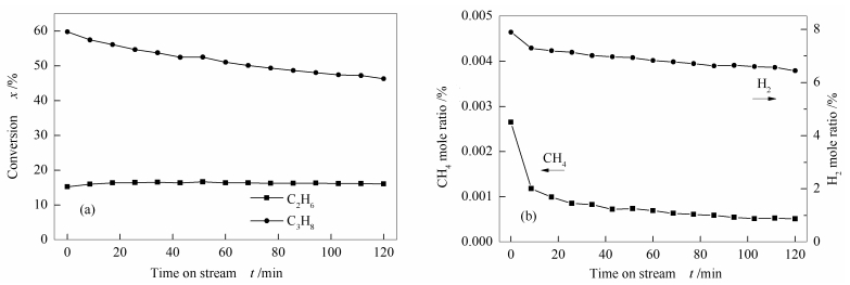 (a): C2H6/C3H8 conversion; (b): CH4/H2 mole ratio