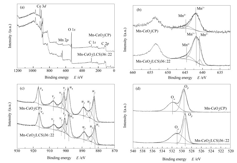 (a): wide range spectra; (b): Mn 2p spectra; (c): Ce 3d spectra; (d): O 1s spectra