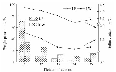 • Two coking coals with high organic sulfur were separated into five fractions with different density ranges by heavy medium separation. The occurrences and transformation of sulfur during pyrolysis of different fractions were investigated by X-ray photoelectron spectroscopy (XPS), solid state 13C nuclear magnetic resonance (13C NMR) and pyrolysis mass spectrometry (Py-MS). The results show that different fractions have significant differences in distribution, occurrence, and chemical environment of sulfur. Organic sulfur is mainly distributed in the low density fraction (D1) and exists in the form of thiophene. Inorganic sulfur such as mineral component is mainly distributed in the high density fraction (D5). As the increase of density of coal fraction, the proportion of aliphatic carbon decreases, and aromatic carbon increases, as well as content of mercaptan and thioether in D1 increases greatly. The volatiles are greatly released since decomposition of aliphatic carbon structure during pyrolysis, which promotes the release of sulfur containing gases, and then improves desulfurization efficiency of D1. However, transformation of sulfur is mainly affected by minerals during D5 pyrolysis.