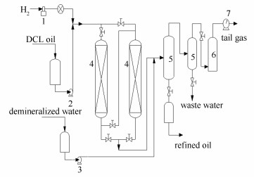 1: compressor; 2: feed pump; 3: water pump; 4: fixed-bed reactor; 5: separator; 6: caustic tank; 7: tail gas flowmeter