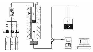 1: H2S; 2: O2; 3: N2; 4: mass flow controllers; 5: commingler; 6: tube furnace; 7: fixed bed reactor; 8: thermocouple; 9: condenser; 10: gas chromatogragh; 11: computer; 12: NaOH wash bottle