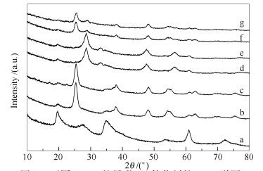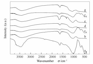 a: laponite; b: Ti-PILC; c: V2O5/Ti-PILC; d: Ce-PILC; e: V2O5/Ce-PILC; f: Ti-Ce-PICL; g: V2O5/Ti-Ce-PILC