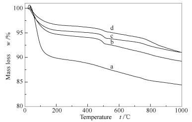 a: laponite; b: V2O5/Ti-PILC; c: V2O5/Ce-PILC; d: V2O5/Ti-Ce-PILC
