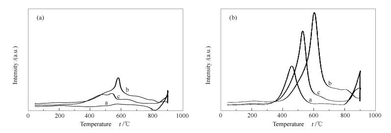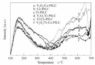 (a) a: Ti-PILC; b: Ce-PILC; c: Ti-Ce-PILC; (b) a: V2O5/Ti-PILC; b: V2O5/Ce-PILC; c: V2O5/Ti-Ce-PILC