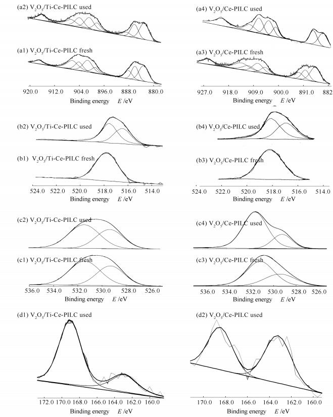 (a): Ce 3d; (b): V 2p; (c): O 1s; (d): S 2p