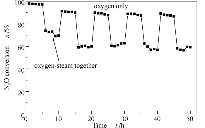 • Mg-Co and Mg-Mn-Co composite oxides with different compositions were prepared by sol-gel method for N2O catalytic decomposition in the presence of oxygen. Of Mg-Mn-Co catalysts, the one with higher activity was impregnated by K2CO3 solution to make K-modified catalyst. These catalysts were characterized by X-ray diffraction(XRD), nitrogen physisorption (BET), scanning electron microscopy(SEM), temperature-programmed reduction of hydrogen(H2-TPR), and temperature-programmed desorption of oxygen(O2-TPD). The effect of preparation parameters such as compositions and potassium loadings on their catalytic activity has been investigated. The results show that K-modified catalysts exhibit better activity and higher resistance towards water in contrast to un-modified catalyst due to the weakness of surface metal-oxygen bonds. Among these catalysts, 0.02K/MgMn0.2Co1.8O4 is the most active, over which 97% and 60% conversions of N2O can be reached at 400℃ after continuous running for 50 h under the atmosphere of oxygen-alone and oxygen-steam together, respectively. When the steam is switched off, the catalytic activity of 0.02K/MgMn0.2Co1.8O4 can be restored to large extent, indicating the good water-resistance of K-modified catalyst.