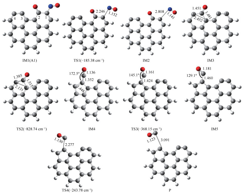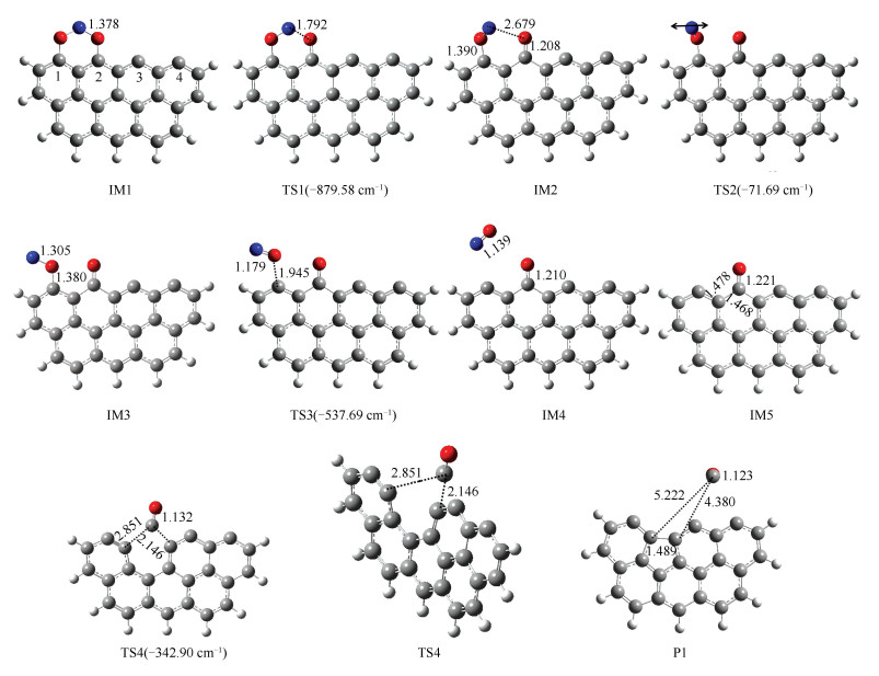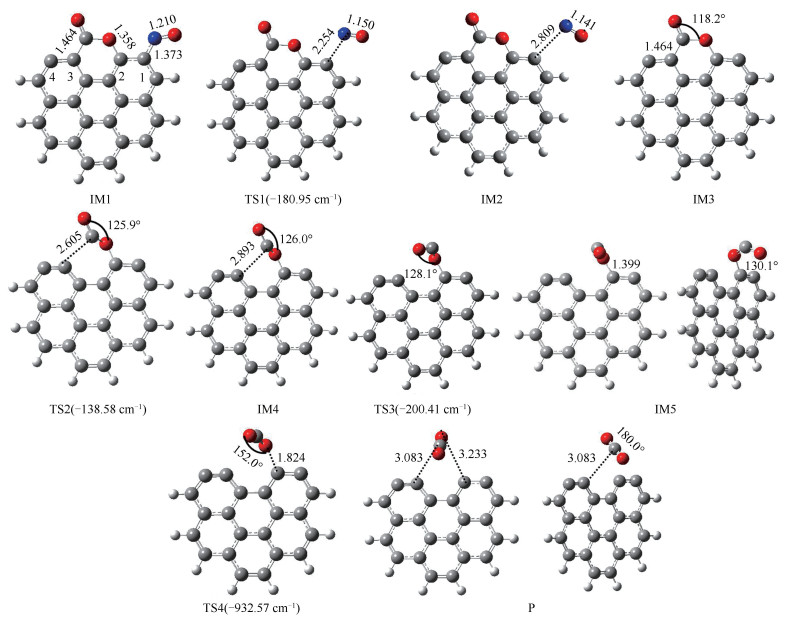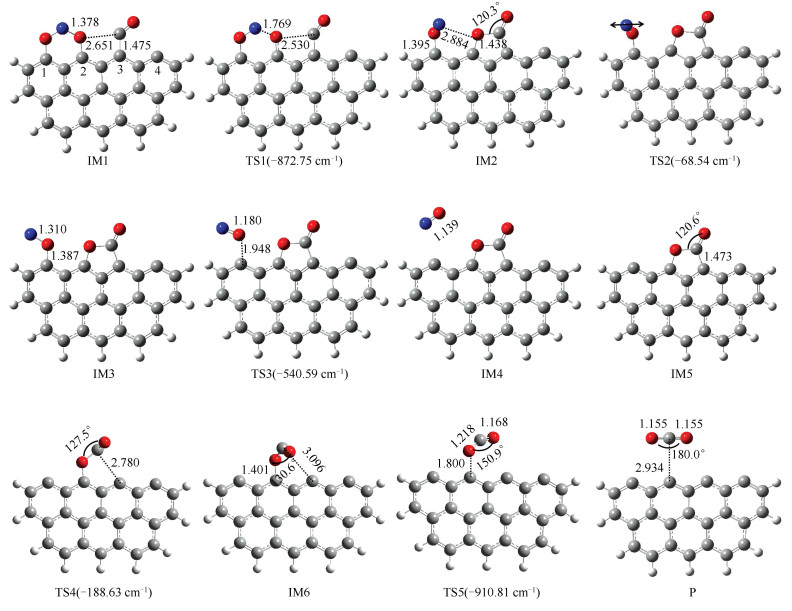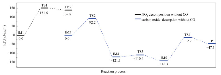 • Based on the quantum chemical density functional theory(DFT), the mechanism of heterogeneous reduction of NO2 on carbonaceous surface was studied. For zigzag and armchair carbonaceous surfaces, M06-2X method and 6-311G(d) basis set were used to optimize the geometry configuration and energy of all stagnation points under different reaction paths, and the reaction paths were analyzed and compared from thermodynamics and kinetics. The role of CO in the heterogeneous reduction of NO2 was deeply investigated, and the effects of carbon surface and reaction temperature on the heterogeneous reaction were also investigated. The results show that the heterogeneous reduction process of NO2 on the carbon surface can be divided into two stages: the reduction stage of NO2 and the desorption stage of carbon oxide. By comparing the reactions without CO molecules, it can be seen that the CO molecules involved in the reaction can reduce the reaction energy barrier of each stage and accelerate the reaction rate of each stage. In the presence of CO molecule, the reaction energy barrier at the reduction stage of NO2 is reduced, which promotes the heterogeneous reaction process of NO2 reduction to NO. CO molecules participating in the reaction can combine with the residual oxygen atoms on the surface to form and release CO2 molecules, which reduces the reaction energy barrier in the release stage of carbon oxides, thus promoting the overall reduction reaction. In addition, the energy barrier of NO2 heterogeneous reduction reaction on zigzag surface is lower and the reaction rate is faster than that on armchair surface, which indicates that the heterogeneous reduction reaction of NO2 is easier on Zigzag carbonaceous surface. Finally, the reaction kinetics analysis shows that the reaction rate of each stage increases with the increase of temperature, which indicates that increasing temperature can promote the heterogeneous reduction of NO2 on the carbonaceous surface.