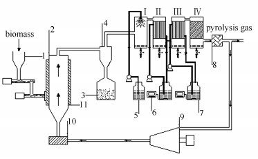 1: hopper; 2: fluidized bed; 3: carbon collector; 4: cyclone separator; 5: spray tank; 6: thermostat; 7: cooling pond; 8: filter; 9: compressor; 10: electric heater room; 11: electric heating sleeve Ⅰ: the 1st step condensation; Ⅱ: the 2nd step condensation; Ⅲ: the 3rd step condensation; Ⅳ: the 4th step condensation