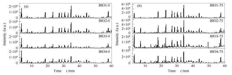 (a): 0 d bio-oils' chromatograms; (b): 75 d bio-oils' chromatograms