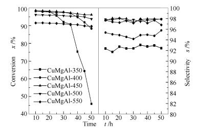 • The CuMgAl hydrotalcite-type precursors were prepared by fractional precipitation process with the mass ratio of m(CuO):m(MgO):m(Al2O3)=25:26:49. CuMgAl-t catalysts were calcined at various temperatures. CuMgAl-t catalysts were characterized by BET, TGA, XRD and H2-TPR and CO2-TPD. The catalytic performance of CuMgAl-t catalysts for the gas phase hydrogenation of furfural to furfuryl alcohol was investigated in a fixed bed reactor. The results showed that the calcination temperatures had effect on catalysts activity, stability and product selectivity. The lower temperature calcined catalysts with reduction can obtain more active center and the higher temperature calcined catalysts had more alkaline sites on the surface of catalysts. CuMgAl catalyst calcined at 450℃ had suitable surface active centers and alkaline sites. Under the reaction conditions of atmospheric pressure, reaction temperature of 180℃, molar ratio of hydrogen to furfural of 5 and volume space velocity of 0.3 h-1, the furfural conversion of 98.64% and furfuryl alcohol selectivity of 97.66% were reached over the CuMgAl-450.