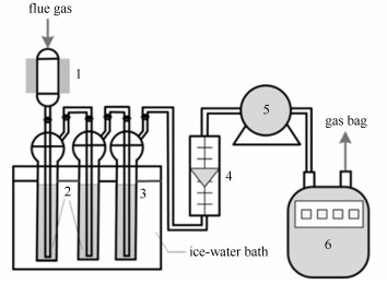1: glass fiber filter and heating tape; 2: 5%HNO3+10%H2O2 absorption solution; 3: silica gel; 4: rotor flow meter; 5: vacuum pump; 6: accumulative flow meter