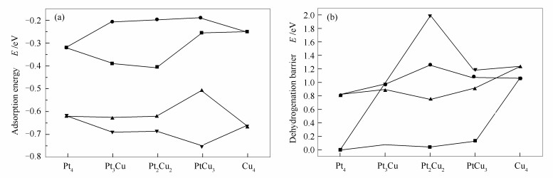 (a): adsorption energies; (b): dehydrogenation barriers ■: H-Pt; ●: H-Cu; ▲: O-Pt; ▼: O-Cu