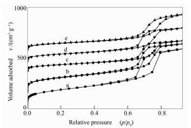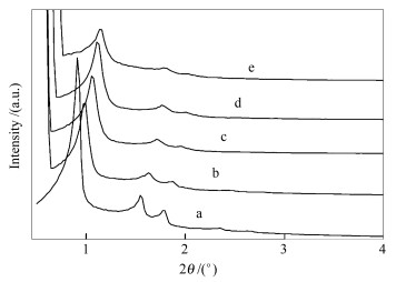 a: HY-SBA-15; b: 10%La-HY-SBA-15; c: 2%Mg-10%La-HY-SBA-15; d: 5%Mg-10%La-HY-SBA-15; e: 8%Mg-10%La-HY-SBA-15