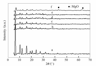 a: HY; b: HY-SBA-15; c: 10%La-HY-SBA-15; d: 2%Mg-10%La-HY-SBA-15; e: 5%Mg-10%La-HY-SBA-15; f: 8%Mg-10%La-HY-SBA-15