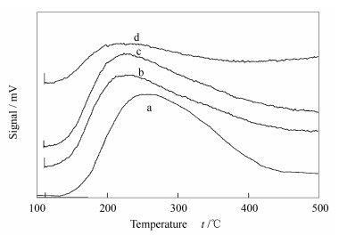 a: 10%La-HY-SBA-15; b: 2%Mg-10%La-HY-SBA-15; c: 5%Mg-10%La-HY-SBA-15; d: 8%Mg-10%La-HY-SBA-15
