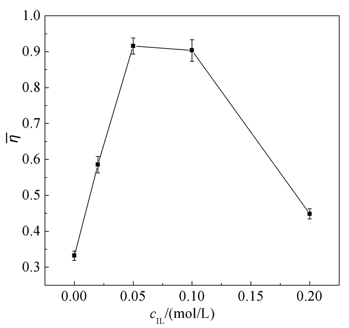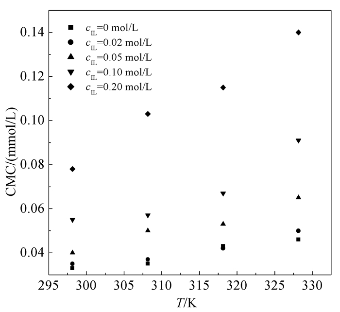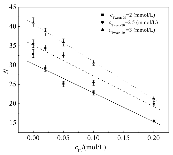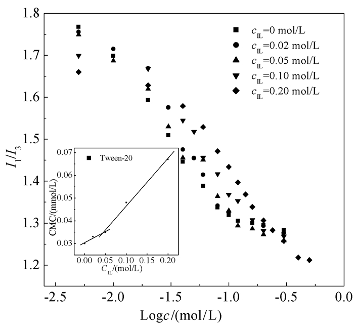 • The presence of ionic liquids (ILs) has a significant impact on the aggregation behavior of surfactants in aqueous solution. In this article, micellization of non-ionic surfactant Tween-20 with the presence of middle and low concentration of hydrophilic ionic liquid [bmim][BF4] (1-butyl-3-methylimidazolium tetrafluoroborate) was investigated. Critical micellization concentration (CMC) of Tween-20 showed an upward trend while increasing concentration of [bmim][BF4] from 0 to 0.2 mol·L-1. Aggregation number of Tween-20 micelles decreased with increasing the concentration of [bmim][BF4], which also indicated that the presence of [bmim][BF4] had great effect on hindering the micellization of Tween-20. Thermodynamic investigation demonstrated that the micellization of Tween-20 was driven by both entropy and enthalpy, and also showed entropy-enthalpy compensation. Meanwhile, average particle size and micro-viscosity of Tween-20 micelles increased first and then decreased with increasing concentration of [bmim][BF4] from 0 to 0.2 mol·L-1, reaching the peak values at cIL=0.05 mol·L-1.