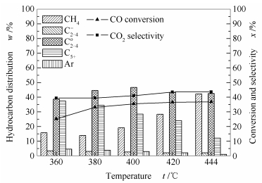(mass ratio = 1:1), H2/CO(volume ratio)=2, p=2.0 MPa, GHSV=3600 mL/(h·gcat), TOS= 4 h, C2-4=: C2-4 olefins, C2-4o: C2-4 alkanes, C5+: hydrocarbons with more than 5 carbons except aromatics, Ar: aromatics