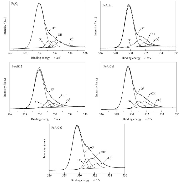 • The upgrading of coal tar by means of steam catalytic cracking (SCC) is a promising method. In this study, Al/Ce and Al/Zr co-doped Fe2O3 catalysts were prepared and used for SCC of coal tar for improving the light tar yield. The SCC was conducted at 550 ℃ for 1 h. It was found that the crystal size decreased over doped Fe2O3 catalysts, and the pore volume and specific surface area increased. XPS analysis showed that lattice oxygen was the majority oxygen species and doping can increased the O- concentration. It was shown that Al/Ce and Al/Zr co-doped Fe2O3 could improve the catalytic activity of Fe2O3. The light tar yield over FeAlZr1, FeAlZr2, FeAlCe1 and FeAlCe2 were 63.2%, 58.1%, 60.2% and 55.1%, respectively, higher than that on Fe2O3 being 49.7%. The oxygen species from steam dissociation and Fe2O3 could take part in the upgrading of coal tar. It was revealed that the specific surface area and the O- on the Fe2O3 catalysts were the primary factors in determining the SCC performance.