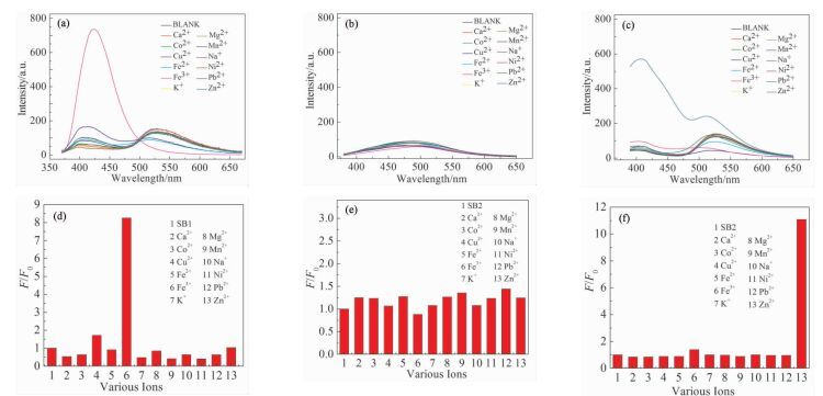 (a) SB1, (b)SB2, (c)SB3; (d)SB1, λem=425nm; (e)SB2, λem=480nm; (f)SB3, λem=420nm