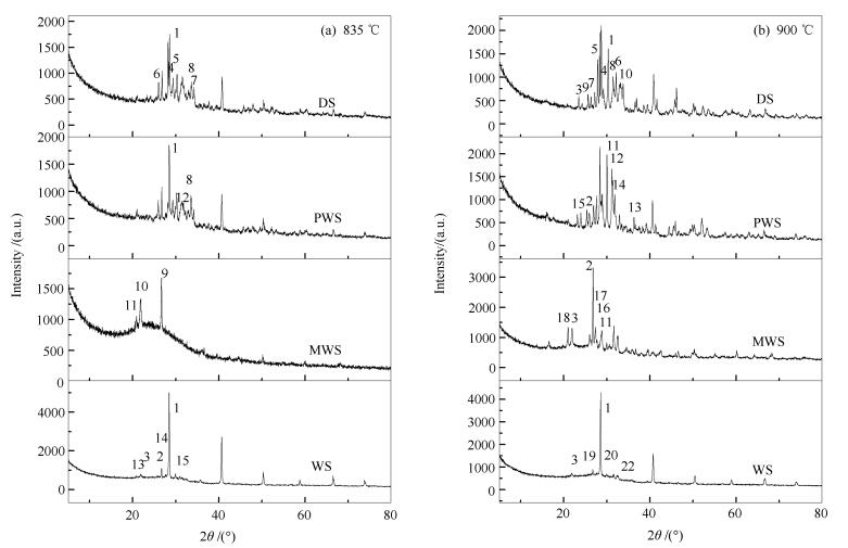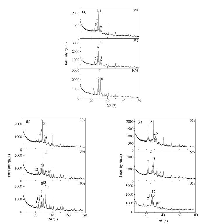 (a): WS-DS 1: KCl(28.4°); 2: AlPO4(26.6°); 3: KNO2(26.9°); 4: K2SO4(30.3°); 5: CaSO4(25.4°); 6: CaMgSi2O6(30.9°); 7: CaSiO3(30.0°); 8: CaMg(CO3)2(30.9°); 9: SiO2(ceosite)(28.9°); 10: Ca2MgSi2O7(31.2°); 11: KH2PO4(23.9°); 12: KNO3(29.4°) (b): WS-PWS 1: KCl(28.4°); 2: SiO2(quartz)(26.7°); 3: CaSiO3(30.0°); 4: CaMg(CO3)2(30.9°); 5: KNO2(26.9°); 6: K2MgSiO4(32.6°); 7: Ca2SiO4(32.9°); 8: SiO2(ceosite)(28.9°); 9: KAlSi3O8(26.7°); 10: Fe2SiO4(36.6°); 11: CaAl2Si2O8(28.6°); 12: AlPO4(21.0°); 13: KNO3(29.4°); 14: K2SO4(30.3°); 15: KHCO3(31.7°); 16: KPO3(26.1°); 17: KH2PO4(23.9°); 18: CaCO3(26.2°) (c): WS-MWS 1: KCl(28.4°); 2: SiO2(quartz)(26.7°); 3: AlPO4(26.6°); 4: KFe2(PO4)2(28.8°); 5: KAl3(OH)6(SO4)2(30.0°); 6: K2CO3(31.6°); 7: SiO2(cristobalite)(21.8°); 8: SiO2(ceosite)(28.9°); 9: MgSiP2(27.5°); 10: Ca3Al2Si3O12(34.7°); 11: KNO3(29.4°); 12: KAlSi2O6(27.3°); 13: K2Ca(SO4)3(27.3°); 14: Ca3Si3O9(27.1°)