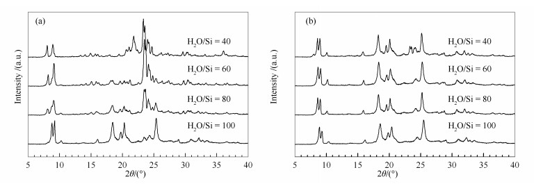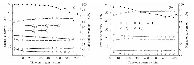 (a): H-Al-B-RUB-13(Si/Al=100); (b): H-Al-B-RUB-13(Si/Al=200) the reactions were carried out at 400 ℃, with a methanol weight space velocity of 1.0 h-1
