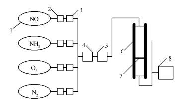 1: air source; 2: reducing valve; 3: mass flowmeter; 4: commingler; 5: preheater; 6: heater; 7: test sample; 8: flue gas analyzer