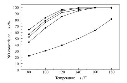 reaction conditions: [NO]=[NH3]=0.05%, [O2]=5%, N2 as balance gas■: Mn-Ce-Co-Ox/PPS-UM; ●: 0.8Mn-Ce-Co-Ox/PPS; ▲: 1.0Mn-Ce-Co-Ox/PPS; ▼: 1.2Mn-Ce-Co-Ox/PPS; ◆: 1.4Mn-Ce-Co-Ox/PPS