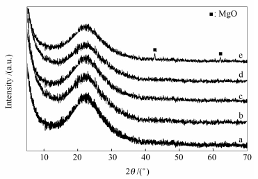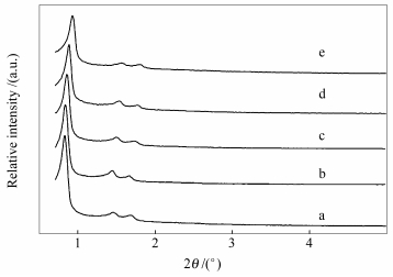 a: SBA-15; b: 15%Ce-SBA-15; c: 5%Mg-15%Ce-SBA-15; d: 7%Mg-15%Ce-SBA-15; e: 10%Mg/15%Ce-SBA-15